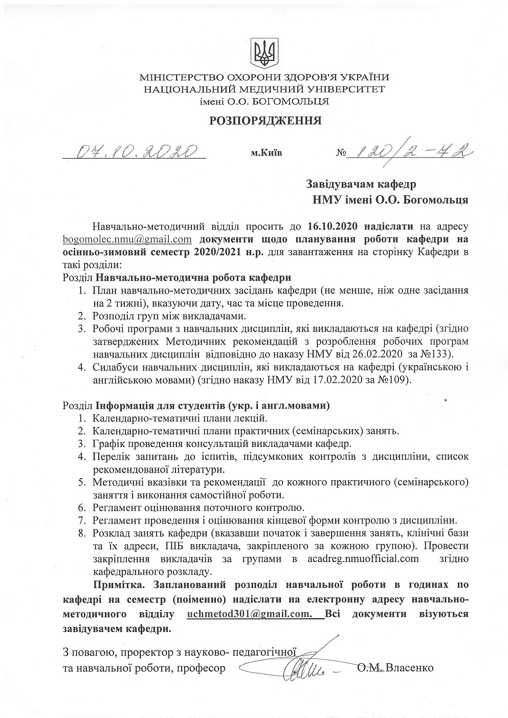 Про надання документів щодо планування роботи кафедр