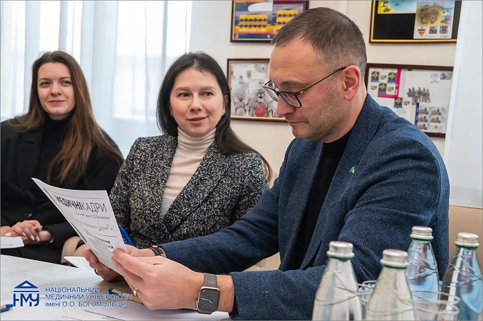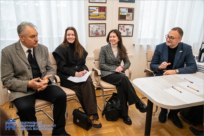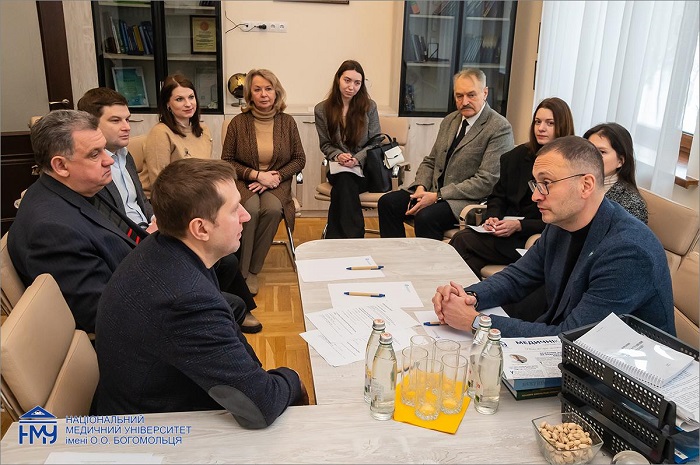 У зустрічі взяли участь ректор НМУ імені О.О. Богомольця, професор Юрій Кучин, проректор з науково-педагогічної роботи та післядипломної освіти Олександр Науменко, проректорка з науково-педагогічної роботи, міжнародних зв’язків та європейської інтеграції Рімма Скрипник, а делегацію ВООЗ очолив голова Бюро в Україні Ярно Хабіхт.