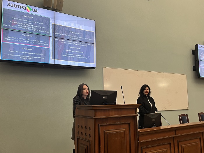 Зустріч організували представники Студентського наукового товариства імені О.А. Киселя за участі команди стипендіальної програми «Завтра.UA» Фонду Віктора Пінчука, щоб докладно розповісти студентам нашого Університету про конкурс. Спікерками виступили менеджерки, координаторка конкурсу Ольга Бабич і координаторка спільноти стипендіатів Анна Бойко.