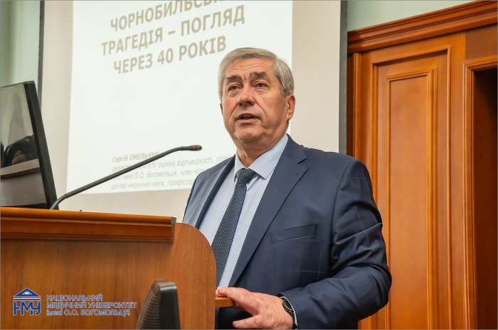 Свою чергою директор Інституту оцінки відповідності, гігієни та екології НМУ Сергій Омельчук представив тему «Чорнобильська трагедія – погляд через 40 років». Він зосередився на питанні формування системи радіаційної безпеки держави, основних ефектах аварії на ЧАЕС, її дії на здоров’я, забруднення територій, продуктів. Також наголосив на найважливіших медичних наслідках та основних сучасних наукових напрямах з мінімізації наслідків Чорнобильської катастрофи, відповідних рекомендаціях.