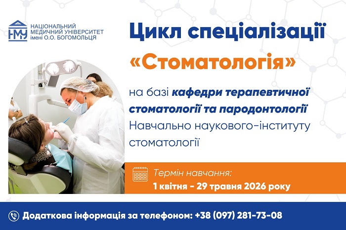 У Національному медичному університеті імені О.О. Богомольця розпочався набір слухачів на цикл спеціалізації «Стоматологія». Навчання проводитиметься з 1 квітня по 29 травня 2026 року на базі кафедри терапевтичної стоматології та пародонтології Навчально-наукового інституту стоматології. Учасники циклу опанують сучасні методи діагностики та лікування захворювань ротової порожнини та щелепно-лицевої ділянки у дорослих та дітей.