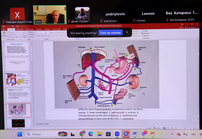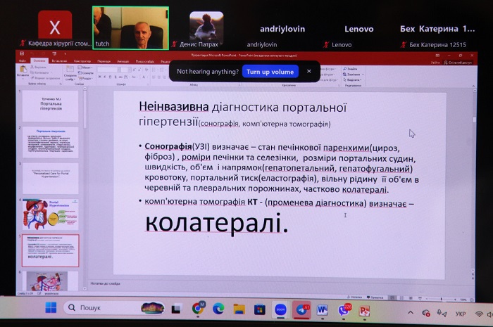 Так, доцентка Діана Рудик розповіла про розробку інноваційних методів боротьби з недугою. Вона зазначила, що вже успішно прооперовано понад 100 пацієнтів із використанням методик, розроблених науковцями кафедри. Про сучасні досягнення колективу кафедри в лікуванні портальної гіпертензії, що потребують мультидисциплінарного підходу, інформували асистенти кафедри Микола Беседінський, Сергій Чуб, аспіранти Андрій Льовін і Денис Патрах. Вони розповіли про різноплановий вектор у наданні допомоги на різних етапах розвитку захворювання.