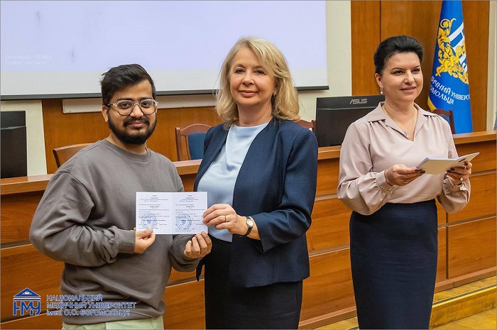 Вручали свідоцтва ректор Університету Юрій Кучин та проректорка з науково-педагогічної роботи, міжнародних зв’язків та європейської інтеграції Рімма Скрипник. Юрій Кучин наголосив на важливості навчання в Університеті іноземних студентів, адже такі міжнародні освітні інтеграційні процеси збагачують академічне середовище, стимулюють спільний партнерський розвиток і сприяють підвищенню якості викладання і клінічної практики.