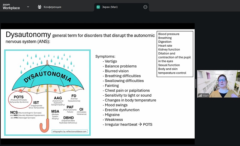 Координаторка освітньої програми I ступеня, докторантка, MSc, фізична терапевтка Університету прикладних наук Сатакунти Марі Торне презентувала сучасне бачення проблеми тривалого перебігу ковіду, як мультисистемного стану з непередбачуваним розвитком та значним впливом на функціональний і психоемоційний стан пацієнтів. Лекторка детально зупинилася на термінології, клінічних проявах і патофізіологічних механізмах постковідного синдрому, зокрема феноменах втоми, когнітивної дисфункції, постекзерційного погіршення стану (PEM/PESE), дисавтономії та неврологічних порушень.