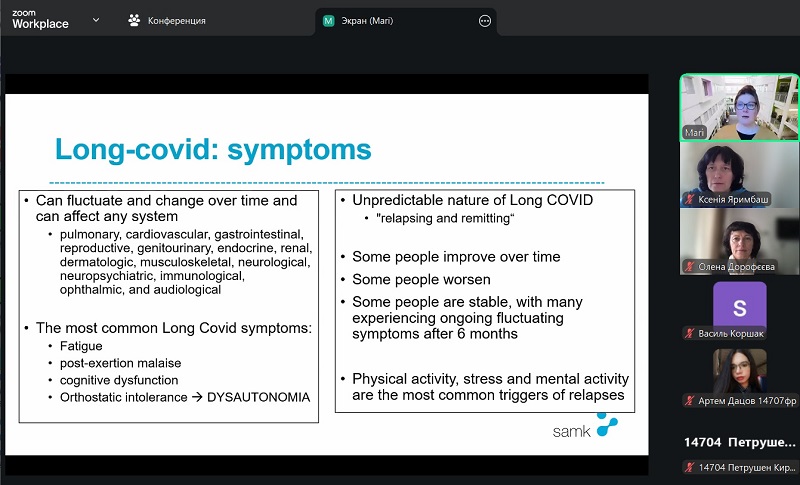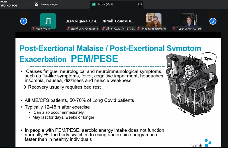 Координаторка освітньої програми I ступеня, докторантка, MSc, фізична терапевтка Університету прикладних наук Сатакунти Марі Торне презентувала сучасне бачення проблеми тривалого перебігу ковіду, як мультисистемного стану з непередбачуваним розвитком та значним впливом на функціональний і психоемоційний стан пацієнтів. Лекторка детально зупинилася на термінології, клінічних проявах і патофізіологічних механізмах постковідного синдрому, зокрема феноменах втоми, когнітивної дисфункції, постекзерційного погіршення стану (PEM/PESE), дисавтономії та неврологічних порушень.