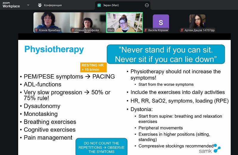 Окрему увагу в межах доповіді було приділено ролі фізичного терапевта у веденні пацієнтів із тривалим перебігом ковіду, принципам фізіотерапевтичного обстеження, оцінці функціональних можливостей, безпечному проведенню навантажень та індивідуальним підходам до реабілітаційного процесу. Експертка наголосила на важливості стратегії pacing (керування темпом для оптимізації результатів, моніторингу симптомів і життєвих показників), а також недопущенні погіршення стану пацієнта внаслідок реабілітаційних втручань.