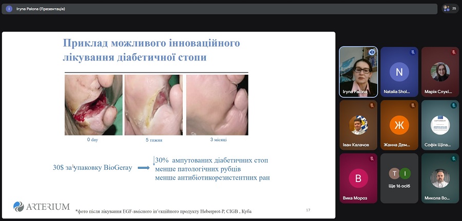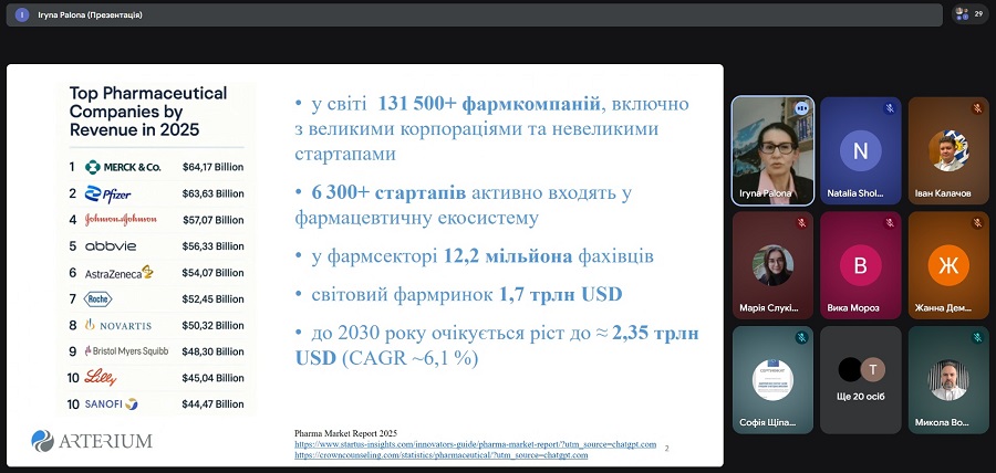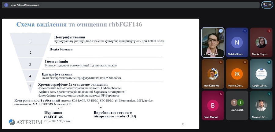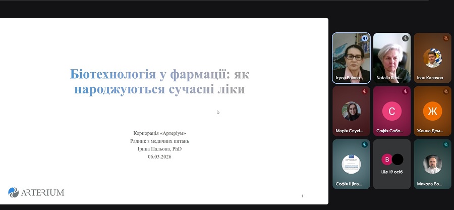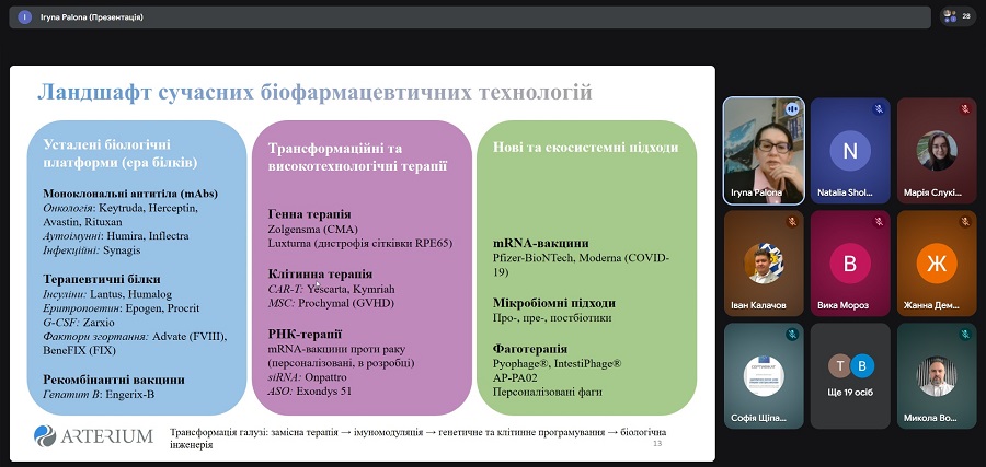 Спікеркою онлайн-лекції виступила докторка філософії з медичних наук, старша радниця з медичних питань служби зі стратегічного розвитку корпорації «Артеріум» Ірина Пальона. Вона розповіла про ключові сучасні підходи до створення лікарських засобів на основі біотехнологій, ознайомила учасників з актуальними тенденціями розвитку біофармацевтичної науки, інноваційними платформами розробки препаратів та загальними етапами їхнього створення – від наукової ідеї до впровадження у медичну практику.
