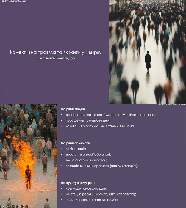 Освітньо-психологічну ініціативу для підтримки ментального здоров’я реалізував Навчально-науковий центр неперервної професійної освіти Інституту післядипломної освіти НМУ імені О.О. Богомольця. Курс передбачав роботу в групі, а ведучою стала клінічна психологиня, соціологиня, сертифікована спеціалістка з превенціїї самогубства, логоконсультантка в навчанні, асистентка Центру Олександра Талтанова.