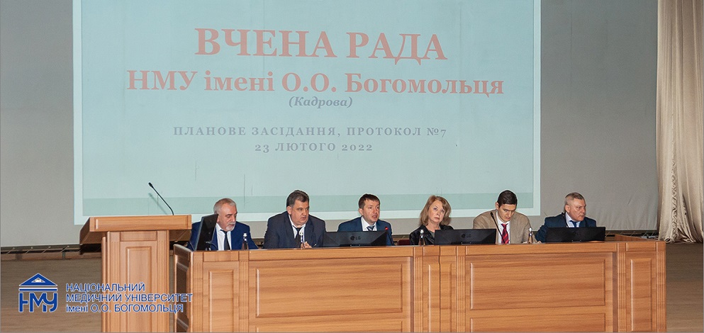 23 лютого 2022 року в актовій залі фізико-хімічного корпусу відбулося чергове засідання Вченої ради НМУ імені О.О. Богомольця за участю ректора, проректорів, деканів факультетів, директорів інститутів, керівників структурних підрозділів. Пересвідчившись у наявності кворуму, відкрив засідання голова Вченої ради, ректор, член-кореспондент НАМН України, професор Ю.Л. Кучин. Затвердивши порядок денний, перш ніж перейти до його розгляду, Юрій Леонідович та Голова профкому співробітників НМУ, професор Л.М. Яременко вручили співробітникам Університету відомчі нагороди та відзнаки –Подяки та Почесні грамоти Вченої ради Університету, атестати професора та доцента.