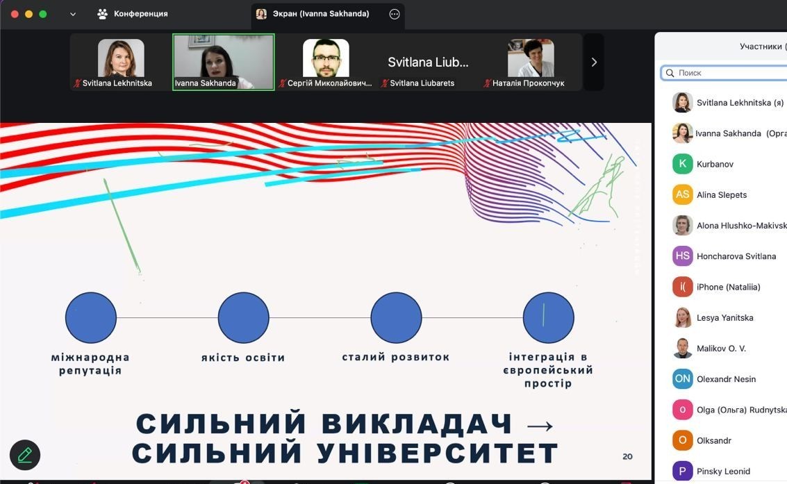 Так, учасники поглибили знання щодо трансформації ролі викладача в умовах міжнародної проєктної діяльності, про можливості академічної мобільності та участі у міжнародних програмах і консорціумах. Вони розглянули інструменти пошуку грантових можливостей, побудови партнерських мереж, обговорили типові бар’єри та страхи на початковому етапі участі в проєктах, шляхи їх подолання.