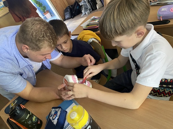 Просвітницький захід відбувся за ініціативи кафедри дитячої терапевтичної стоматології та профілактики стоматологічних захворювань. Під керівництвом професорки кафедри Ольги Коваль студенти-стоматологи на практиці відпрацювали методи гігієнічного навчання та виховання. Що важливо, кожен захід організували з урахуванням особливостей психологічного підходу до дітей різного віку. Урок гігієни для учнів середньої школи провели в лекційно-ігровій формі, індивідуально для кожної дитини продемонстрували правильний метод чищення зубів для закріплення мануальних навичок індивідуальної гігієни порожнини рота. З дітьми також обговорили дотримання здорового способу життя та вплив харчування на здоров’я зубів.