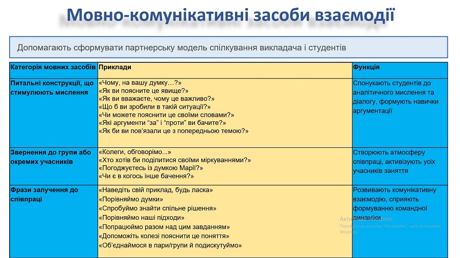 Під час лекції, яку провела викладачка кафедри мовної підготовки НМУ Олена Коваль, також розглянули три основні стилі взаємодії зі студентською аудиторією та обговорили, які мовні засоби допомагають формувати партнерські взаємини, заохочувати студентів до активності й створювати простір для продуктивного навчання.