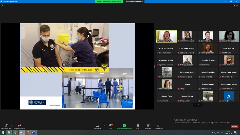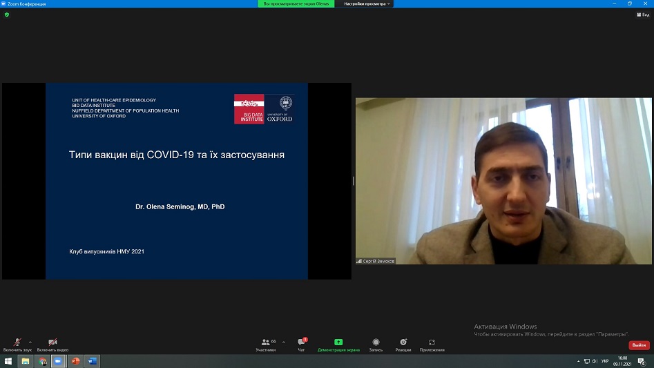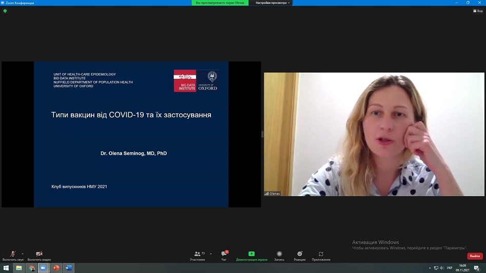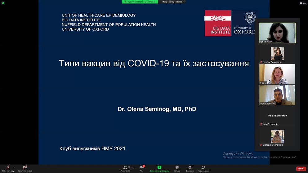 9 листопада 2021 року відбулася онлайн-зустріч «Вакцини від коронавірусу СOVID-19 та їх застосування». Запрошеним спікером була Олена Олександрівна Семіног– випускниця НМУ імені О.О. Богомольця, перший лікар з України, яка отримала ступінь доктора наук на кафедрі популяційного здоров’я при медичному факультеті Оксфордського Університету.