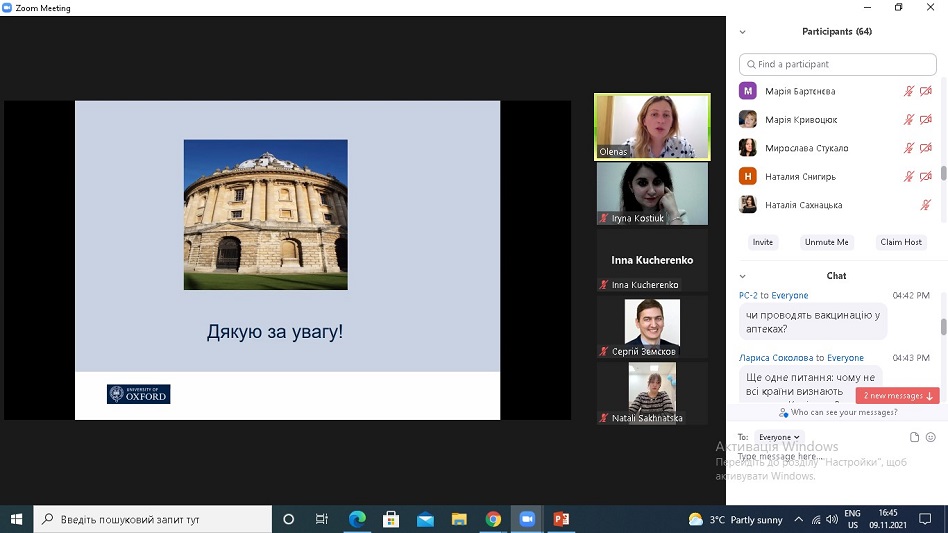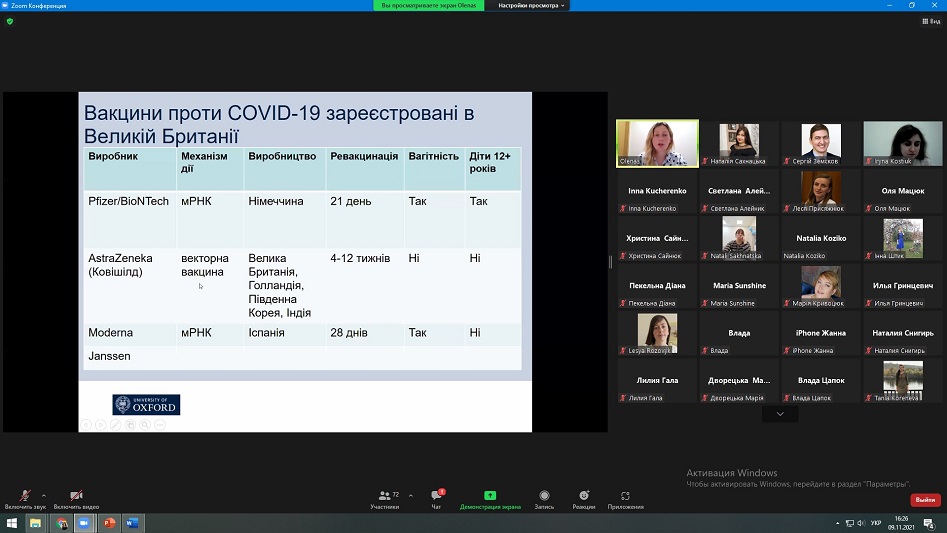 У своїй доповіді Олена Олександрівна висвітлила ключові аспекти вакцинації проти коронавірусної хвороби, можливі ризики та ускладнення від вакцин, а також поділилася досвідом вакцинації у Великій Британії. Лекція викликала жвавий інтерес у присутніх, учасники ставили безліч популярних запитань, на які спікер надала вичерпні відповіді.