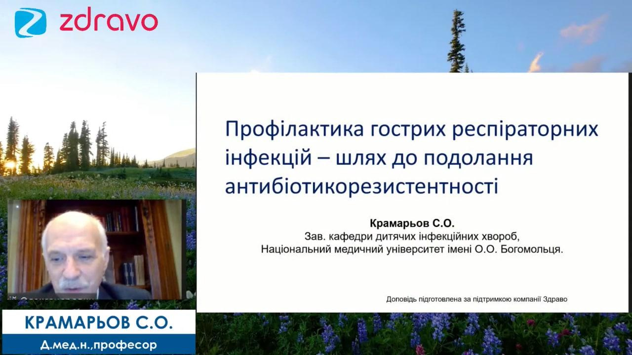 Професор С.О. Крамарьова представив доповідь — «Профілактика гострих респіраторнім інфекцій – шлях до подолання антибіотикорезистентності». У своїй роботі Сергій Олександрович навів можливі шляхи подолання антибіотикорезистентності, розповів сучасні проблеми та рекурентні респіраторні інфекції. Йшлося про можливі шляхи подолання антибіотикорезистентності, сучасні проблеми та рекурентні респіраторні інфекції.