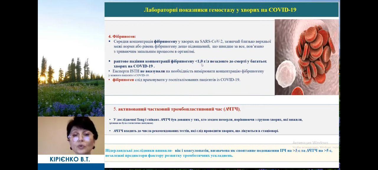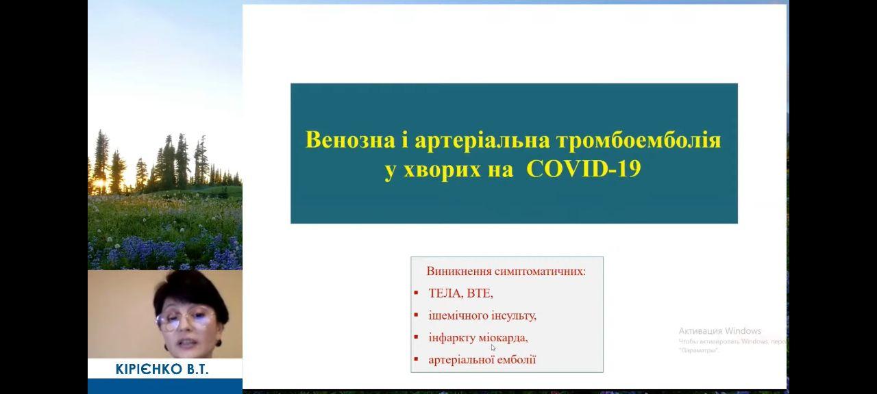 - «Порушення гемостазу у хворих на CОVID-19. Тактика ведення пацієнта» — кандидат медичних наук, доцент кафедри терапії, інфекційних хвороб та дерматовенерології ІПО НМУ імені О.О. Богомольця В.Т. Кірієнко. Йшлося про лабораторні показники гомеостазу у хворих, сучасні протоколи ведення стаціонарних хворих, клінічну картину ТЕЛА.