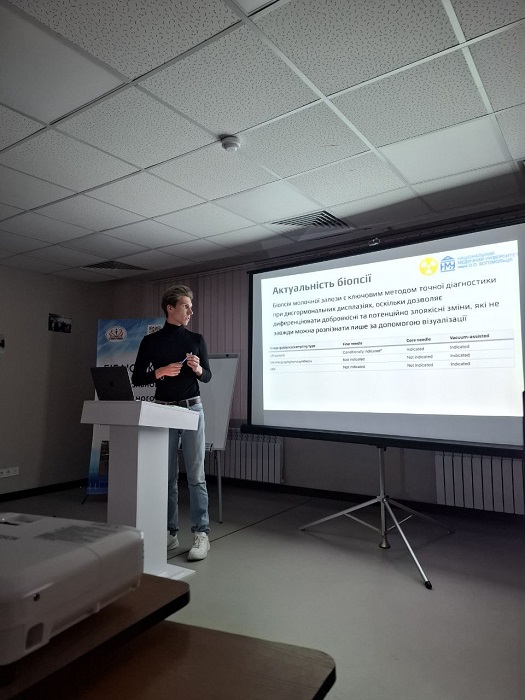 Основні методи інструментального дослідження раку молочної залози та важливість використання радіонуклідних методів окреслила під час виступу студентка 3 курсу Уляна Івашина. Про роль біопсії в діагностиці раку молочної залози доповів староста гуртка радіології та радіаційної медицини, шестикурсник Данило Євдошенко. Принципи клінічної діагностики та схеми лікування раку молочної залози презентувала четвертокурсниця Діана Костенко. Вона звернула увагу на сучасні протоколи лікування раку молочної залози та важливість визначення молекулярного та гістологічного підтипу для успішного лікування патології.