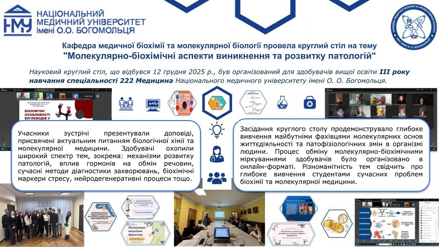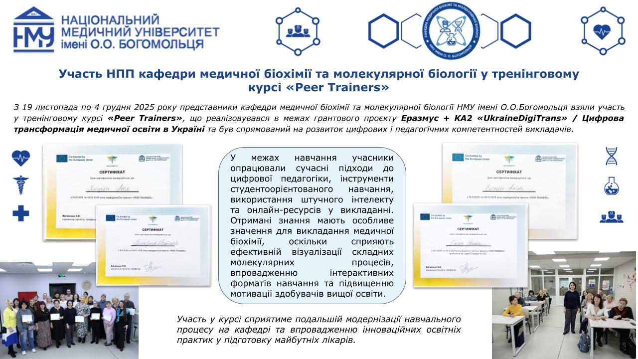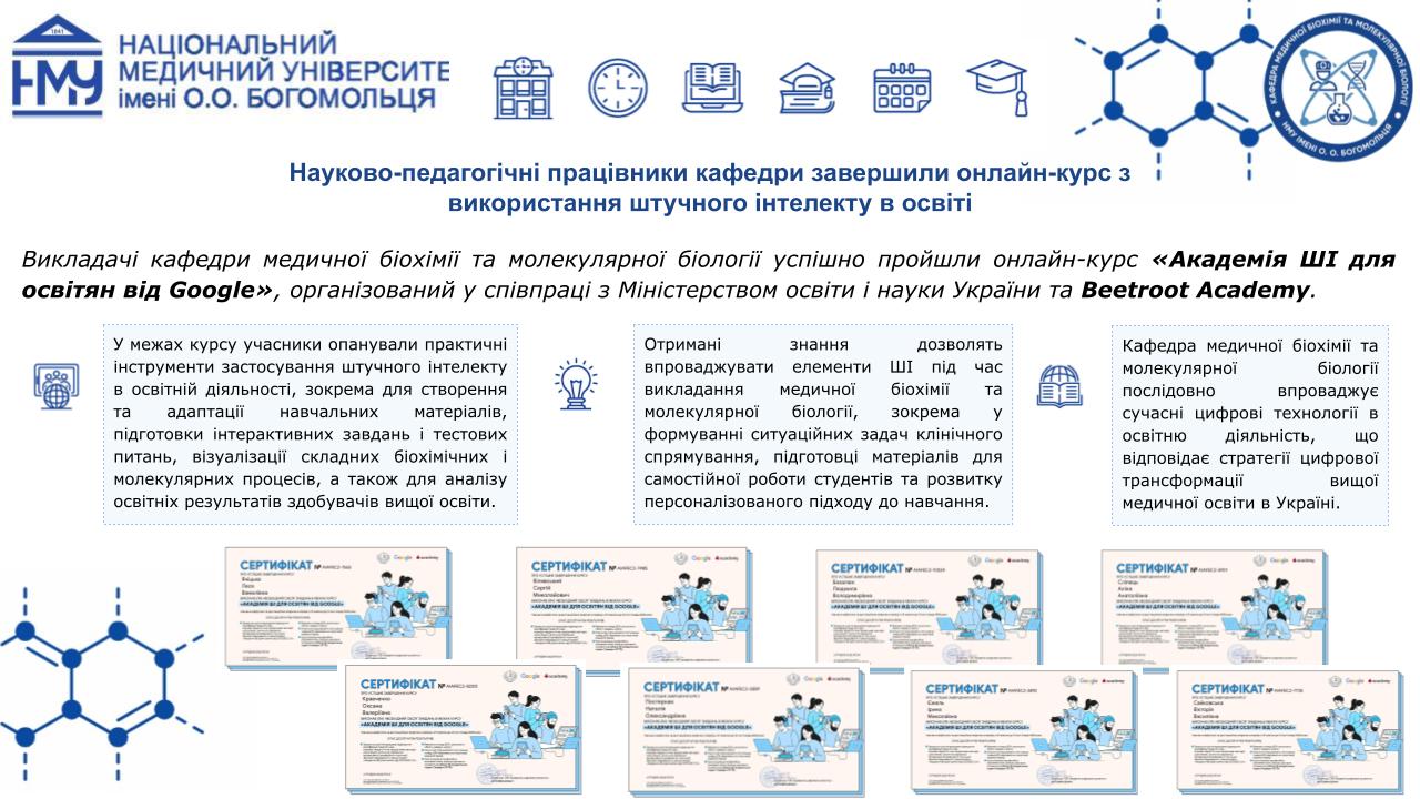 Професорсько-викладацький склад кафедри медичної біохімії та молекулярної біології Національного медичного університету імені О.О.Богомольця, а саме: завідувачка кафедри, доцент Яніцька Леся Василівна, професор Сліпчук Валентина Леонідівна, доценти: Стеченко Олена Володимирівна, Оберніхіна Наталія Володимирівна, Токменко Інна Ігорівна, Терещенко Наталія Юріївна, Філіппова Лариса Валеріївна та старші викладачі закладу вищої освіти: Макарова Наталія Миколаївна, Базалюк Людмила Володимирівна, Горкуненко Оксана Олександрівна, Малишевська Ганна Ігорівна, Кравченко Оксана Валеріївна, Сайковська Вікторія Василівна за особистий внесок у розвиток науково-дослідної роботи при підготовці медичних кадрів з медичної біохімії були прийняті в члени Українського біохімічного товариства.