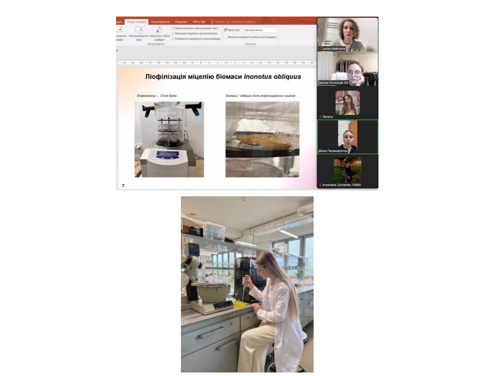 Діана Паламаренко доповіла про виконання проєкту «Дослідження складу культур міцелію гриба Chaga (Inonotus obliquus)», яке базувалося на визначенні вмісту фенольних сполук у міцеліальних культурах із використанням ультрависокоефективної рідинної хроматографії (UHPLC). У межах роботи вона опанувала методики приготування поживних середовищ, асептичного культивування грибів, ліофілізації біомаси та екстракції фенольних сполук, а також набула практичних навичок роботи з лабораторним обладнанням, зокрема автоклавом, ламінарною шафою, ротаційним випарником і хроматографом UHPLC.