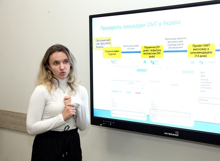 Доцентка кафедри Ірина Костюк, кандидатка фармацевтичних наук, консультантка проєкту USAID/SAFEMed, презентувала етапи пілотного проєкту з госпітальної ОМТ та його попередні результати.