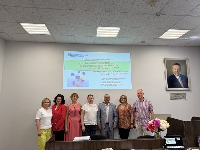 30 січня 2024 року аспірантка кафедри Олена Філінюк представила дисертаційне дослідження «Науково-методичні підходи впровадження госпітальної оцінки медичних технологій в системі охорони здоров’я» на здобуття ступеня доктора філософії у галузі знань 22 «Охорона здоров’я» за спеціальністю 226 «Фармація, промислова фармація». Дисертантка довела актуальність і практичне значення обраної теми, що стосується апробації навчальної цільової програми з госпітальної оцінки медичних технологій.