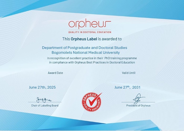 27 червня 2025 року Національний медичний університет імені О.О. Богомольця отримав сертифікат відповідності освітньо-наукових програм третього освітньо-наукового рівня (доктор філософії) міжнародним стандартам Організації університетських програм PhD в галузі біомедицини та охорони здоров’я в Європі (ORPHEUS). Це вагоме міжнародне визнання стало результатом всебічної зовнішньої оцінки, що базувалася на звіті про самооцінювання та підсумках онлайн-зустрічі у травні цього року. До акредитації була долучена доцентка кафедри Ірина Костюк. Сертифікат ORPHEUS підтверджує відповідність PhD-програм НМУ імені О.О. Богомольця європейським стандартам та відкриває нові можливості для міжнародної співпраці й академічної мобільності