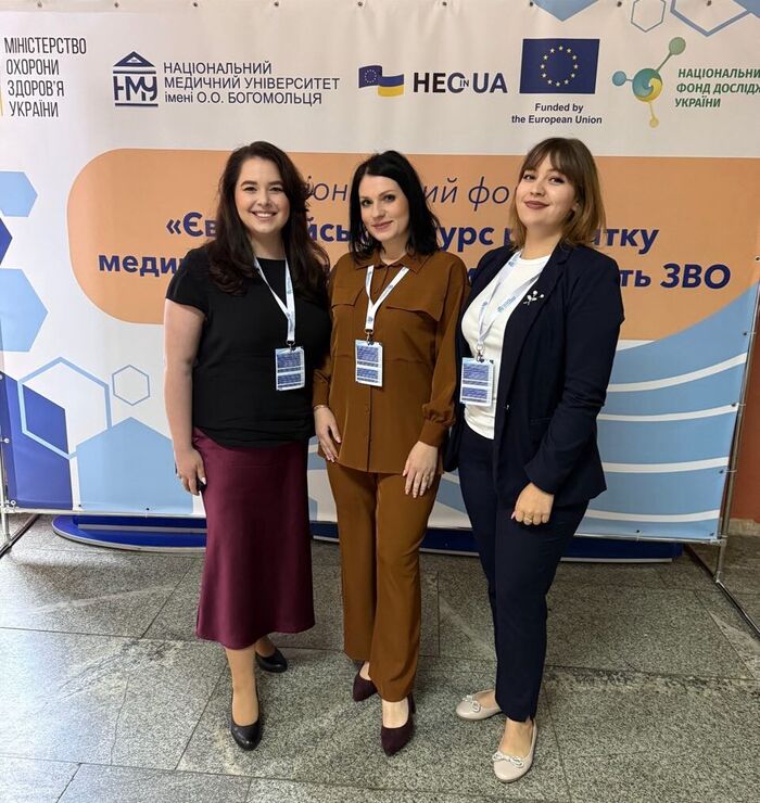 13 травня 2025 року співробітниці кафедри організації та економіки фармації НМУ імені О.О. Богомольця – доцентки Ірина Костюк та Іванна Саханда, асистентки Ярослава Рафальська та Наталія Сахнацька – долучилися до національного форуму «Європейський курс розвитку медичної науки: ефективна участь ЗВО в грантових програмах», який уперше відбувся в НМУ. Організатором форуму виступив Центр міжнародної академічної мобільності та грантових проєктів НМУ за ініціативи Міністерства охорони здоров’я України та за участі Національного фонду досліджень України.