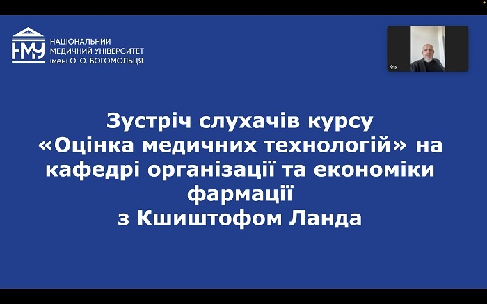 13 травня онлайн відбулася мотиваційна зустріч студентів 4 курсу фармацевтичного факультету Національного медичного університету імені О.О. Богомольця із міжнародним експертом з доказової медицини та оцінки медичних технологій, Почесним доктором нашого Університету Кшиштофом Ландою. Зустріч відбулася в інтерактивному форматі та стосувалася актуальних питань оцінки медичних технологій у сучасній системі охорони здоров’я. Захід відбувся в межах викладання вибіркової дисципліни «Оцінка медичних технологій» за авторством професора Костянтина Косяченка та доцентки Ірини Костюк, яку в нинішньому навчальному році впровадили в освітній процес на кафедрі організації та економіки фармації.
