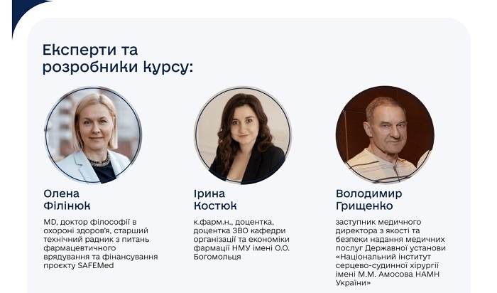 3-5 травня 2023 року в рамках проєкту SAFEMed USAID відбувся онлайн-тренінг «Госпітальна оцінка медичних технологій (ОМТ) – практичний інструмент для прийняття науково обґрунтованих рішень на рівні закладів охорони здоров’я» для мультидисциплінарної команди Національного інституту серцево-судинної хірургії імені М.М. Амосова. Команду спікерів представили співробітники кафедри – завідувач, радник директора Державного експертного центру МОЗ України, доктор фармацевтичних наук, професор Костянтин Косяченко та кандидатка фармацевтичних наук, доцентка Ірина Костюк. Модератором та спікером заходу виступила консультант SAFEMed USAID, асистент кафедри організації та економіки фармації НМУ Олена Філінюк. Під час заходу наголошувалося, що госпітальна оцінка медичних технологій надасть змогу виконувати лікування пацієнтів ефективніше та підвищить якість надання медичної допомоги. Наприкінці тренінгу керівництво Національного інституту серцево-судинної хірургії імені М.М. Амосова подякувало ректору НМУ Юрію Кучину та директору Державного експертного центру МОЗ України Михайлу Бабенку за сприяння в впровадженні та розвитку госпітальної ОМТ в Україні.