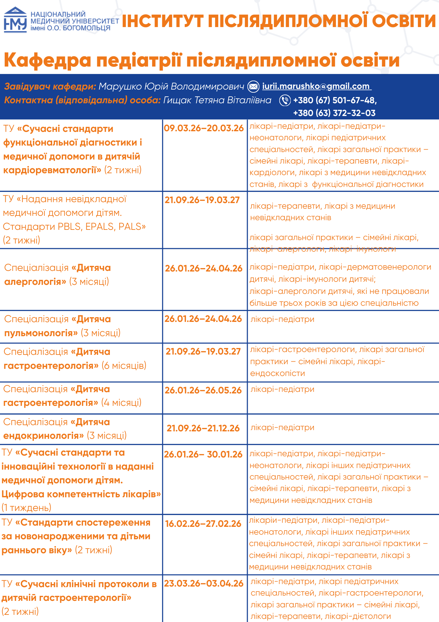 Наказ МОЗ України від 25 липня 2023р № 1347 «Про затвердження Переліку циклів спеціалізації та тематичного удосконалення за лікарськими та фармацевтичними (провізорськими) спеціальностями»: https://zakon.rada.gov.ua/laws/show/z1362-23#Text