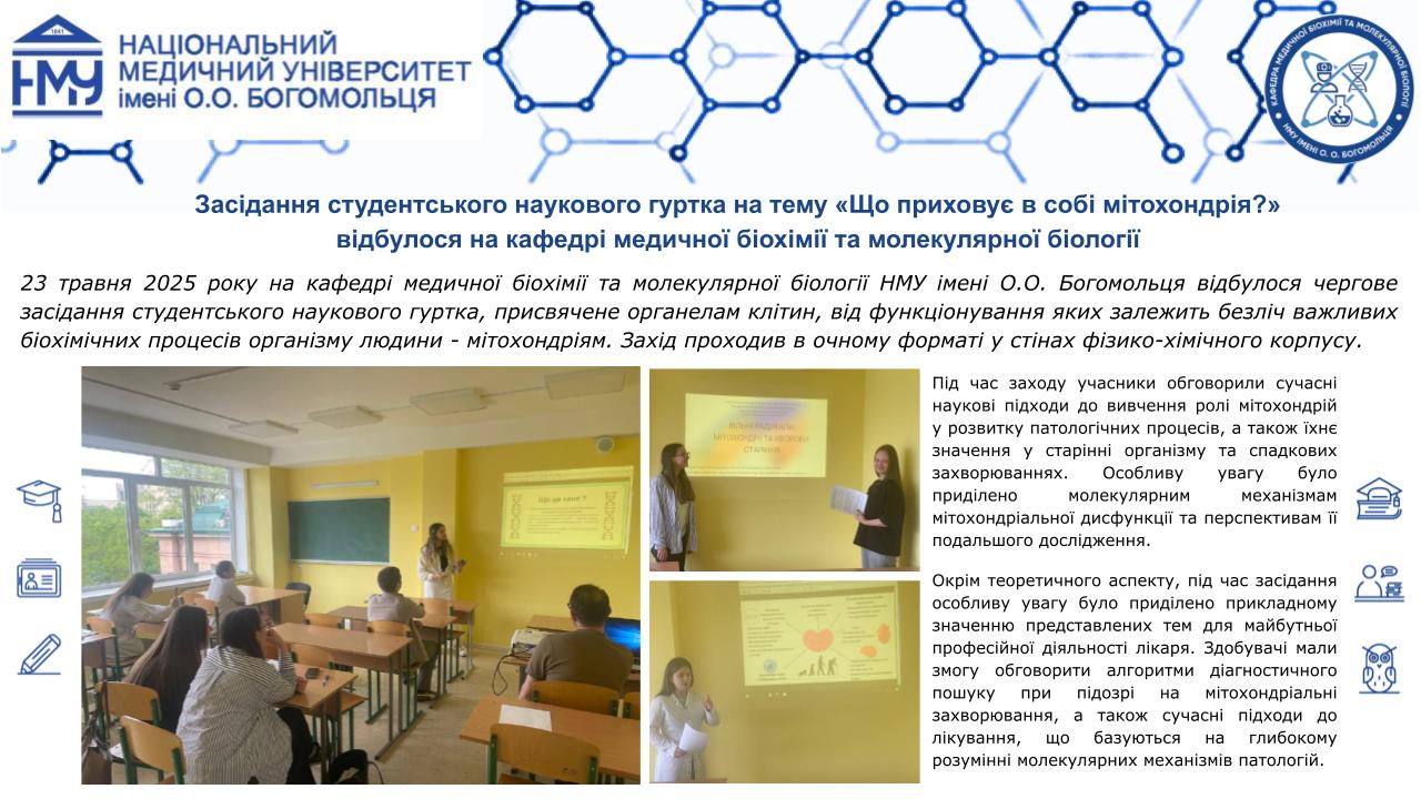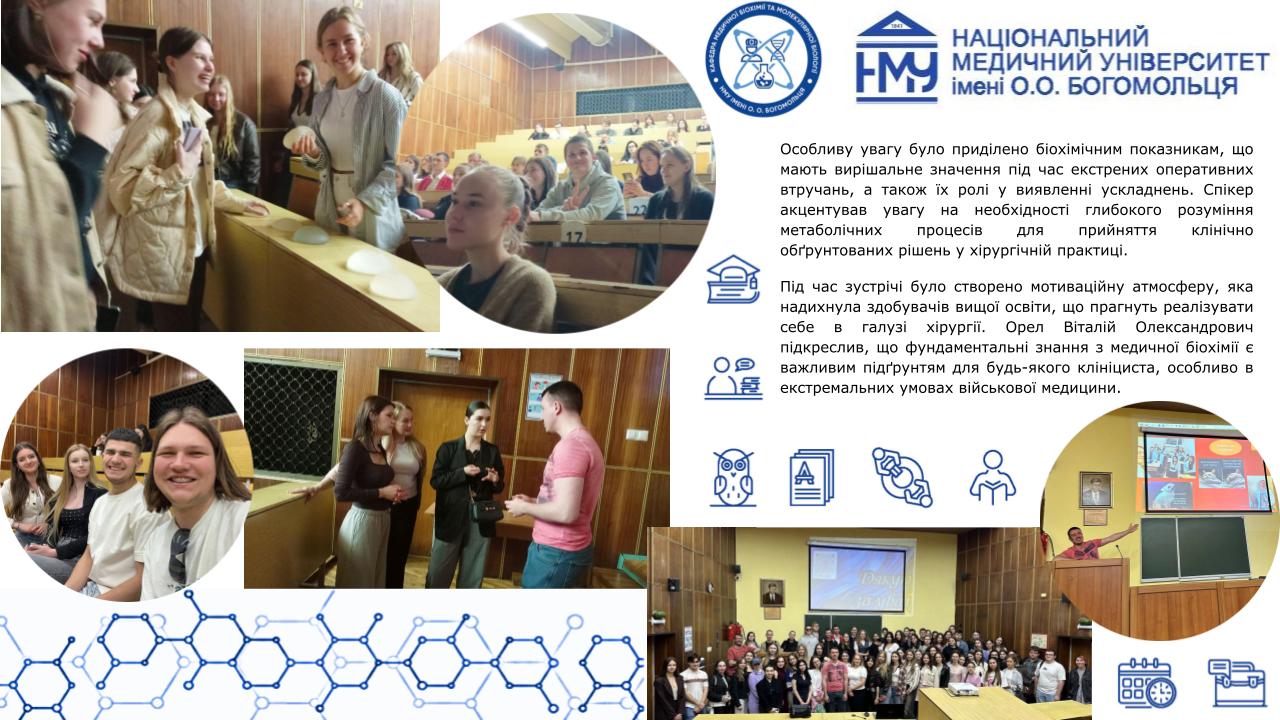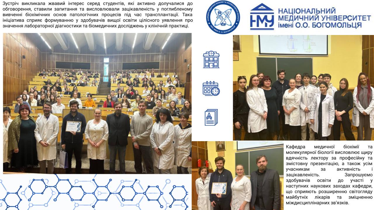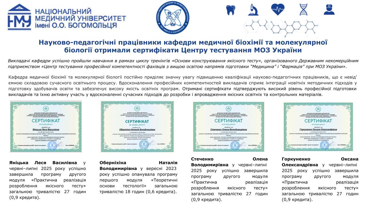 Професорсько-викладацький склад кафедри медичної біохімії та молекулярної біології Національного медичного університету імені О.О.Богомольця, а саме: завідувачка кафедри, доцент Яніцька Леся Василівна, професор Сліпчук Валентина Леонідівна, доценти: Стеченко Олена Володимирівна, Оберніхіна Наталія Володимирівна, Токменко Інна Ігорівна, Терещенко Наталія Юріївна, Філіппова Лариса Валеріївна та старші викладачі закладу вищої освіти: Макарова Наталія Миколаївна, Базалюк Людмила Володимирівна, Горкуненко Оксана Олександрівна, Малишевська Ганна Ігорівна, Кравченко Оксана Валеріївна, Сайковська Вікторія Василівна за особистий внесок у розвиток науково-дослідної роботи при підготовці медичних кадрів з медичної біохімії були прийняті в члени Українського біохімічного товариства.