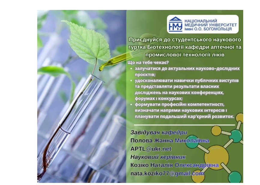 Запрошуємо вас приєднатися до студентського наукового гуртка з біотехнології кафедри аптечної та промислової технології ліків Участь у СНГ з біотехнології кафедри АПТЛ надає можливість: