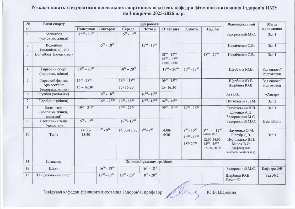 Баскетболу – керівник Задорожний Микола Семенович – старший викладач кафедри фізичного виховання і здоров`я. +380675816575.