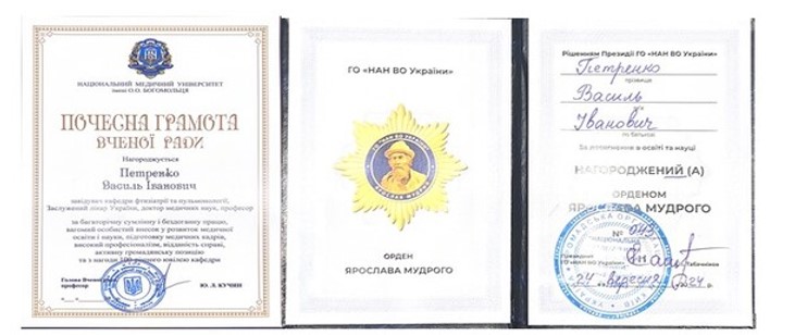 Почесна грамотавченої ради НМУ імені О.О. Богомольця та орден Ярослава Мудроговід ГО «НАН ВО України» завідувачу кафедри, професору Петренку Василю Івановичу за сумлінну працю, вагомий особистий внесок у розвиток охорони здоров’я, надання кваліфікованої медичної допомоги, високий професіоналізм