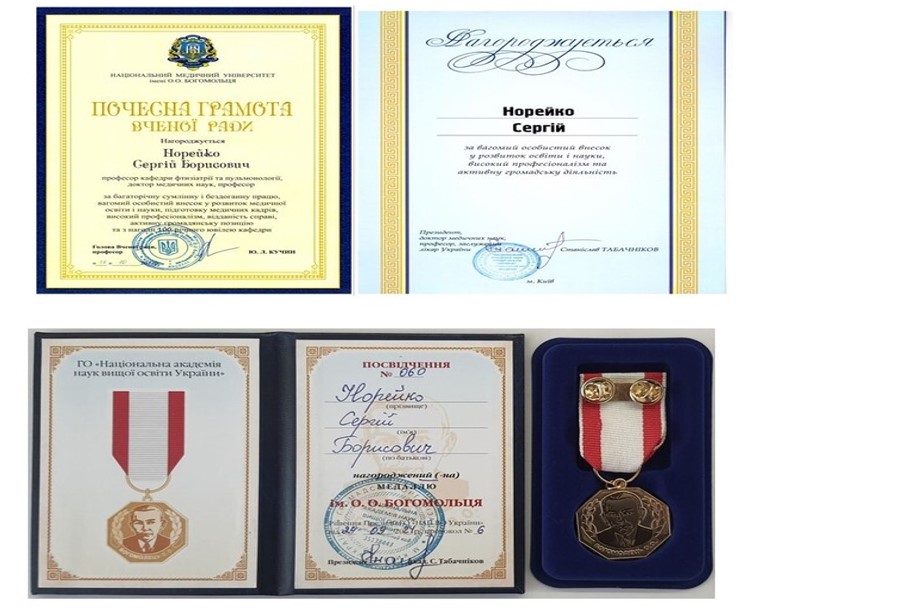 Почесна грамотавченої ради НМУ імені О.О. Богомольця тамедальім. О.О. Богомольцявід ГО «НАН ВО України»професору Норейку Сергію Борисовичу за сумлінну працю, вагомий особистий внесок у розвиток охорони здоров’я, надання кваліфікованої медичної допомоги, високий професіоналізм