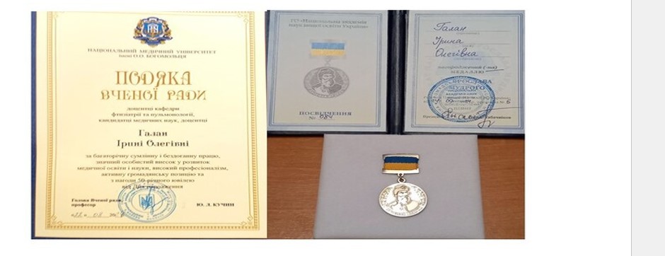 Подяка вченої ради НМУ імені О.О. Богомольця та медаль Ярослава Мудрого від ГО «НАН ВО України»  доценту Галан Ірині Олегівні за сумлінну працю, вагомий особистий внесок у розвиток охорони здоров’я, надання кваліфікованої медичної допомоги, високий професіоналізм