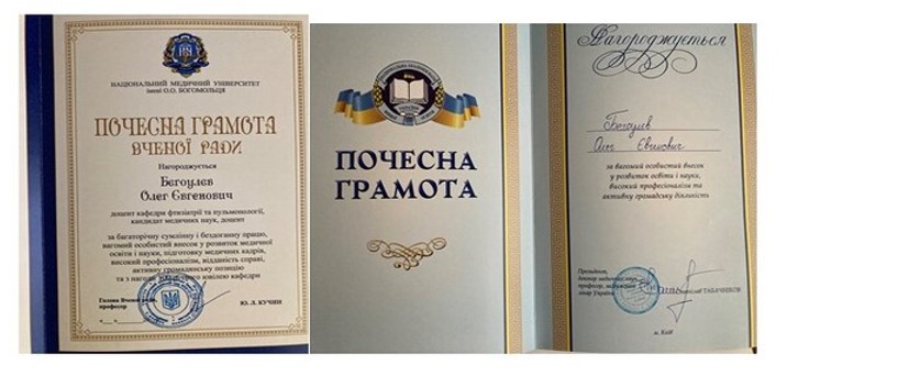 Почесна грамота вченої ради НМУ імені О.О. Богомольця та Почесна Грамота від ГО «НАН ВО України» доценту Бєгоулєву Олегу Євгеновичу за сумлінну працю, вагомий особистий внесок у розвиток охорони здоров’я, надання кваліфікованої медичної допомоги, високий професіоналізм