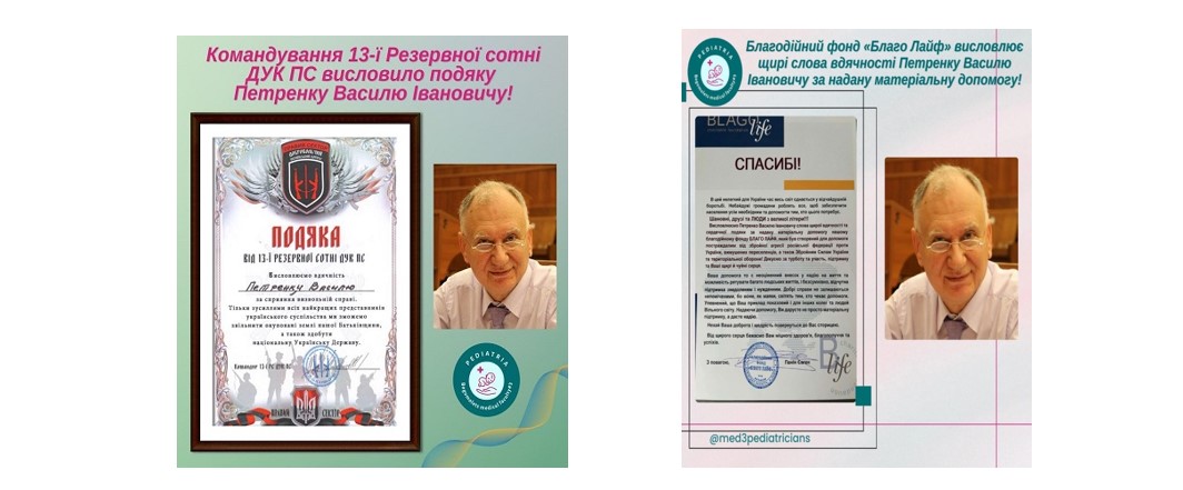 Благодійний фонд «Благо Лайф» висловив щирі слова вдячності Петренку Василю Івановичу професору, завідувачу кафедри фтизіатрії та пульмонології, заслуженому лікарю України, за надану ним матеріальну допомогу, яка стане невід’ємною частиною роботи фонду в підтримці постраждалих від збройної агресії російської федерації проти України, вимушених переселенців, а також Збройним Силам України та територіальної оборони!