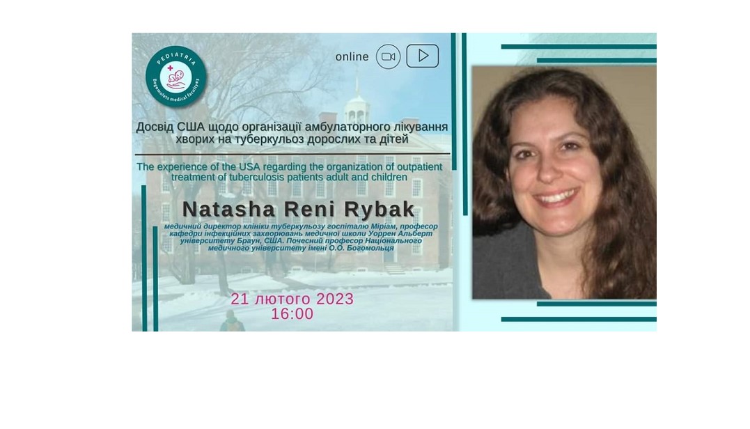 Спікер: Наташа Рені Рибак – медичний директор клініки туберкульозу госпіталю Міріам, професор кафедри інфекційних захворювань медичної школи Уоррен Альберт університету Браун, Провіденс, штат Род Айленд, США Почесний професор Національного медичного університету імені О.О. Богомольця.