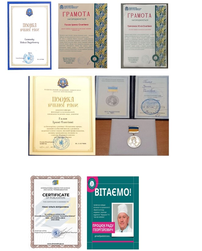 Процюк Р.Г. (професор кафедри) – Почесна Грамота Вченої Ради Національного медичного університету імені О.О. Богомольця (жовтень 2024), Грамота медичного факультету №3
