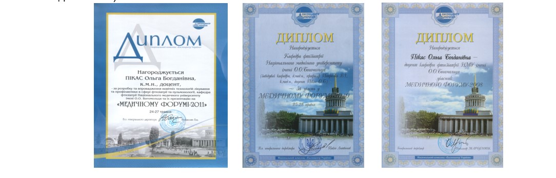 – VІІ Міжнародний медичний форум «Інновації в медицині – здоров’я нації» (Київ, 19-21 квітня 2016 р.) – проф. Пікас О.Б. (нагороджена дипломом)