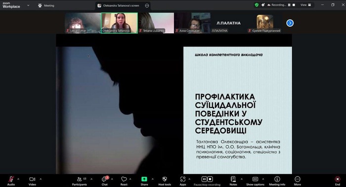 Учасники Школи компетентного викладача вивчали основи профілактики суїцидів У межах проєкту «Школа компетентного викладача НМУ імені О.О. Богомольця», що реалізується у Національному медичному університеті імені О.О. Богомольця, 7 листопада відбувся черговий семінар на актуальну тему – «Основи профілактики суїцидів». Учасники обговорили основні причини самогубства, ознаки, що вказують на підвищений ризик суїциду, отримали рекомендації для забезпечення необхідної підтримки людині, у разі виявлення у неї суїцидальних думок та планів