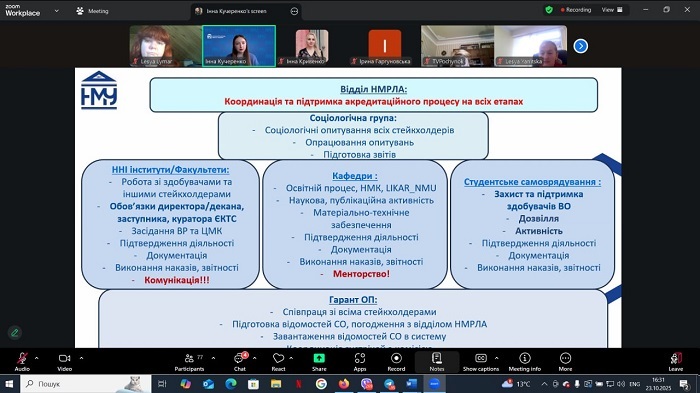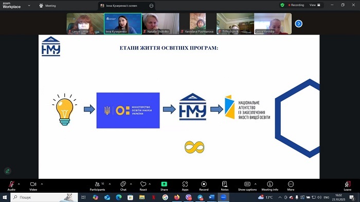 Під час інтенсивної онлайн-зустрічі начальниця відділу навчально-методичної роботи, ліцензування та акредитації, доцентка Інна Кучеренко детально зупинилася на усіх ключових аспектах, які необхідні для якісного забезпечення освітнього процесу: підвищення кваліфікації, робота з електронними ресурсами, звітність.