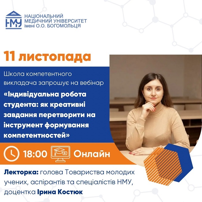 11 листопада у межах Школи компетентного викладача НМУ імені О.О. Богомольця відбудеться вебінар на тему «Індивідуальна робота студента: як креативні завдання перетворити на інструмент формування компетентностей». Спікерка заходу – голова Товариства молодих учених, аспірантів та спеціалістів НМУ, доцентка Ірина Костюк.