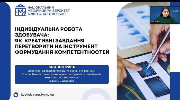 Прикладами завдань, які стимулюють творчість у медичній та фармацевтичній освіті, поділилася голова Товариства молодих учених, аспірантів та спеціалістів НМУ, доцентка Ірина Костюк. Доповідачка розповіла про роль, ефективність та запровадження у навчальних процес завдань зі створення міні-проєктів, клінічних кейсів, підготовки інфографіки чи постерів, а також участь у міждисциплінарних обговореннях. Усе це стимулює творчість та розвиває корисні навички та вміння.