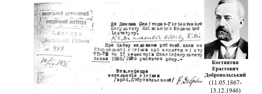 Історія ж кафедри комунальної гігієни, як самостійного структурного підрозділу, в Київському медичному інституті (КМІ), 90-років від дня заснування якої в столичному закладі вищої медичної освіти, було відзначено на початку 2025/2026 навчального року, бере початок з 1935 року. Саме того року відзначив 5-тирічний ювілей санітарно-гігієнічний факультет, створений в КМІ 14 травня 1930 р. (дивись нижче), коли в газеті «Червоний медик» було надруковано оголощенння про перший набір студентів на санітарно-гігієнічний факультет КМІ. Першим деканом факультету був призначений доцент Познанський Семен Семенович, якого в 1935 році замінив, на посаді декана, професор Радченко Сергій Іванович, завідувач кафедри соціаьної гігієни. Того ж року завідівач кафедри загальної гігієни професор Костянтин Ерастович Добровольський своїм листом за № 488 від 10.07.1935 р. надіслав до декана санітарно-гігієнічного факультету також планового відділу КМІ «Робочий план кафедри комунальної гігієни про заняття зі студентами VІІ-VІІІ семестрів Сангігфакультету восени 1935/1936 року.