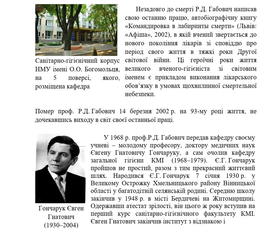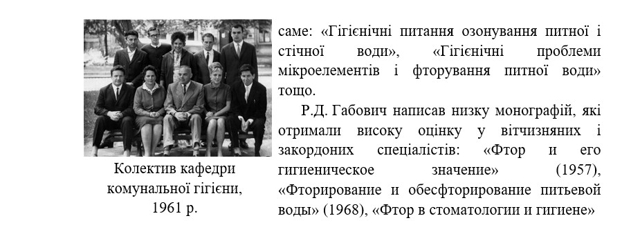 (1969 р., перевидана в США в 1977 р.). «Гигиенические проблемы фторирования питьевой воды» (1978) та інші. Поряд з цим науково-педагогічні працівники кафедри провели численні дослідження з гігієни лікарень. Результати цих досліджень викликали резонанс серед науковців-гігієністів. Професор Р.Д. Габович організував і в 1966 р. провів першу всесоюзну конференцію з гігієни лікарень. У результаті роботи конференції були вироблені загальні напрямки та методичні підходи для подальшого вивчення цього питання. Під керівництвом Р.Д. Габовича над проблемою «Гігієнічні основи містобудування» плідно працювали доцент М.В. Крижанівська, ассистент Т.К. Ігнатьєва. До проведення практичних занять з комунальної гігієни залучалися досвічені санітарні лікарі Київської міської СЕС В.Х. Явдощук, Є. Кацен, Дніпровського річкового водопроводу В.А. Дунаєвський, Д.Г. Андрусенко та відомчої лабораторії Київського управління водопровідно-каналізаційного господарства С.Й. Добрушина, інспектори відділу комунальної гігієни Головного санепідуправління МОЗ УРСР С.П. Кортильов, В.П. Дорошенко, В.М. Кучерява.
