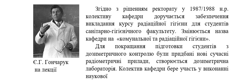 Студентам прочитано 7 нових тем лекцій, введено 7 нових практичних занять з методики вивчення здоров’я населення у зв’язку з забрудненням навколишнього середовища з використанням студентами електронно-обчислювальної техніки. З цією ж метою колектив кафедри видав навчальний посібник «Изучение влияния факторов окружающей среды на здоровье населения» (1989). У програму з комунальної гігієни були введені нові практичні заняття з вивчення впливу водного фактору, житлово-побутових умов, забрудненого атмосферного повітря і ґрунту на здоров’я населення.