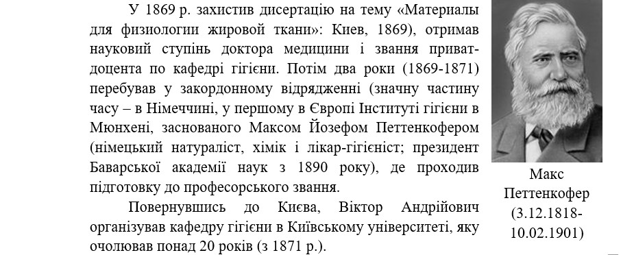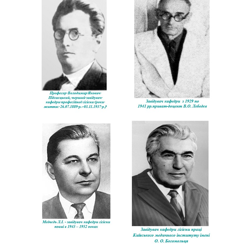 На кафедрі значну педагогічну та науково-дослідницьку роботу, активну громадську медико-профілактичну діяльність проводили її завідувачі, знані гігієністи – проф. В.Д. Орлов (1893-1914), проф. К.Е. Добровольський (1914-1922), проф. О.В. Корчак-Чепурківський (1922-1923), проф. В.В. Удовенко (1923-1929), доц. Ф.А. Баштан (1930-1932).