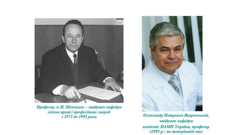 Працею співробітників кафедри повернені вітчизняній науці і медичній громадськості імена безвинно засуджених і посмертно реабілітованих вчених-гігієністів праці (В.Я. Підгаєцького, М.Л. Кудрицького), а також національні наукові пріоритети в питаннях медицини праці. Останні 3 роки кафедра працює в умовах боротьби і подолання наслідків пандемії COVID-19, а з лютого 2022 р. ще й в умовах, повномасштабної російської агресії.